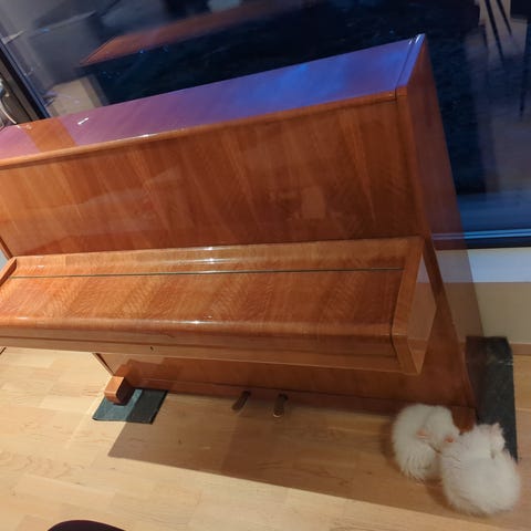 Ritter & Co. upright piano i treverk med tradisjonelt design. Pianoet har et klassisk utseende med detaljer i tre, og standard tangenter i hvitt og svart. Passer for bruk i hjem eller undervisningsmiljøer.