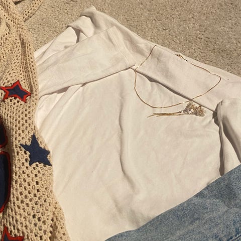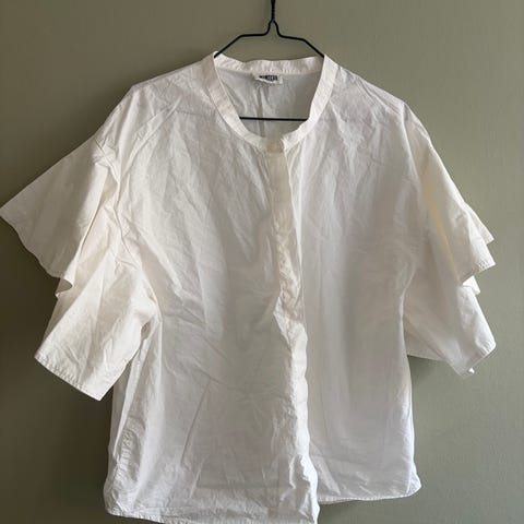 New Yorker bluse i størrelse M. Blusen er hvit og har detaljer som knapper på mansjettene og dekorative blonder på fronten. Passer til kvinner. Den har fått en sminke flekk på seg som vist på bildet