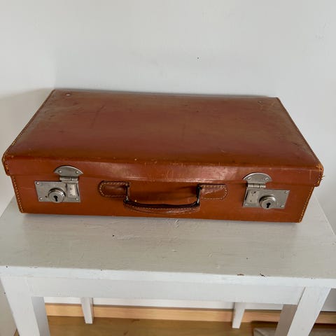 Stor flott reise koffert i lær. Noe rust ellers funker lukkemekanismen greit. Jeg har dessverre ikke lenger nøklene.