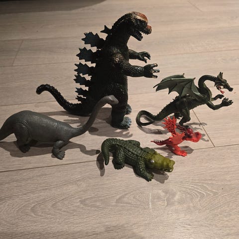 Guttungen selger pent brukte dinosaurer og drager. 200 kr for alle sammen.