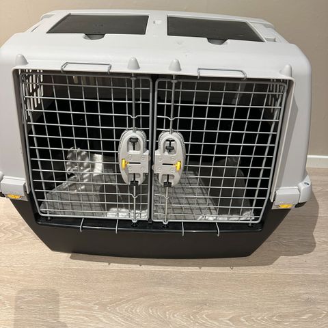 Stevneskap i god stand. Gjennomsiktig plast. Oppheng til to saler, kroker på begge sider og inni døren. Små rom under topp lokket. Er lås på men mangler nøkkel. Lås kan monteres på utsiden evt. To hjul, så lett å trille for å ha med i henger og på stevner.