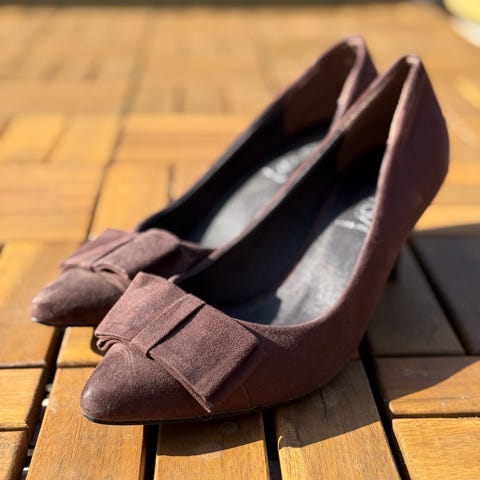 Pent brukte pensko fra Gabor, størrelse 5. Hæl på 5 cm, veldig gode å gå i og føles stabile på foten. Laget i semsket skinn i matt lilla, med dekorative tøyblomster på tuppen.
