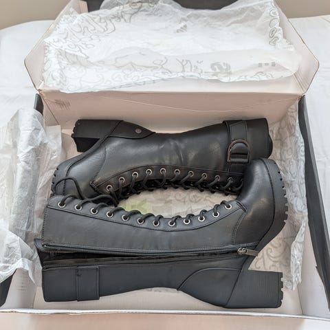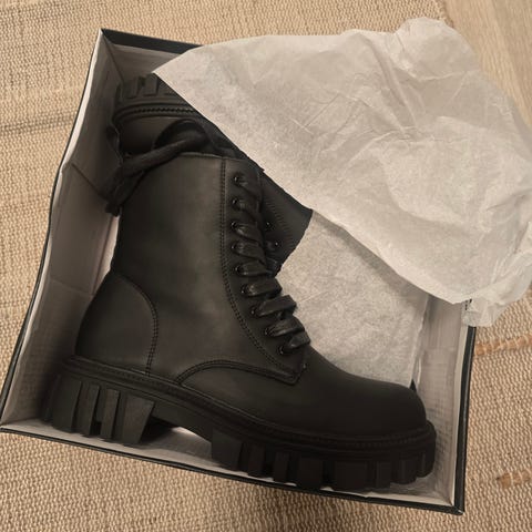 Kule støvletter med kjetting bak selges . Kun prøvd å gå med innendørs