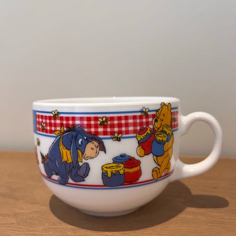 Disney Donald Duck eggekopp i keramikk med tegneseriemotiv rundt hele koppen. Eggekoppen har kremfarget bakgrunn med fargerike figurer og gullfarget kant øverst og nederst. Passer til servering av kokt egg eller som samleobjekt for Disney- og Donald Duck-effekter.
