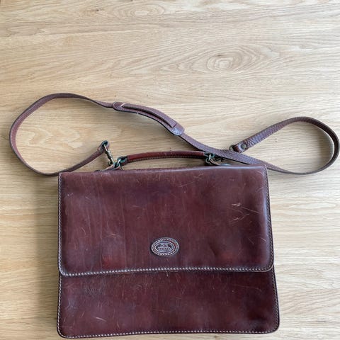 Ubrukt mørkebrun dokumentveske til salgs. 40x30 cm med skulderrem. To hovedrom med plass til bærbar PC.