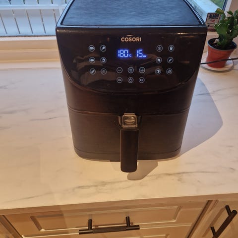 Emerio Airfryer med svart og hvit farge. Luftfrityrkoker med temperaturkontroll og timerfunksjon. Egnet for tilberedning av mat med varmluftsteknologi.aldri vært brukt