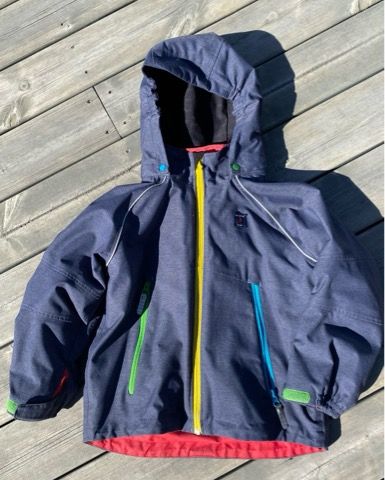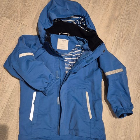 Skalljakke str 122 fra Polarn o. Pyret selges for 250,-. Det er et lite hull ved håndleddet (se bilder), og ellers noen bruksmerker, men ingen synlige hull.