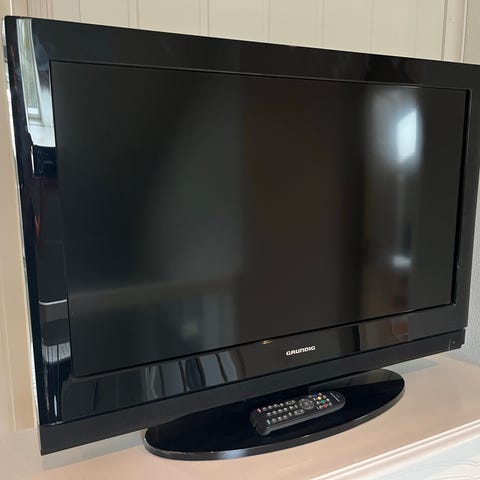 Grundig TV med tilhørende fjernkontroll. TV-en har en svart ramme og skjerm, fjernkontrollen er svart med flere funksjonsknapper. Har ikke innebygd smart tv, men det kan fint løses dersom den kobles til en Apple TV, tv boks eller lignende.