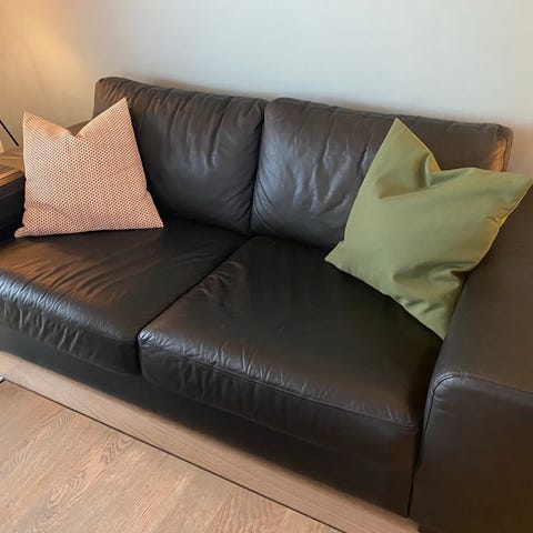Fin skinnsofa til salgs. Kjøpt på Finn for noen måneder siden. Litt riper her og der, men det synes kun på nært hold. Den er veldig solid og komfortabel. Selges fordi vi ikke har plass til den på neste hybel.