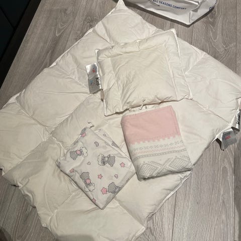 Selger en pent brukt baby dundyne med tilhørende pute i bomull. Dynen er 65 x 80 cm. Brukt til et barn hos oss i et røyke- og dyrefritt hjem.