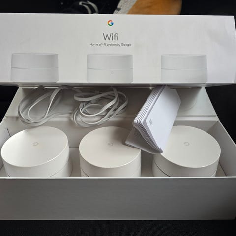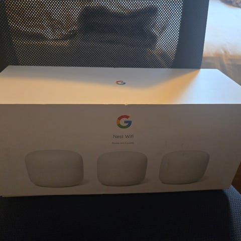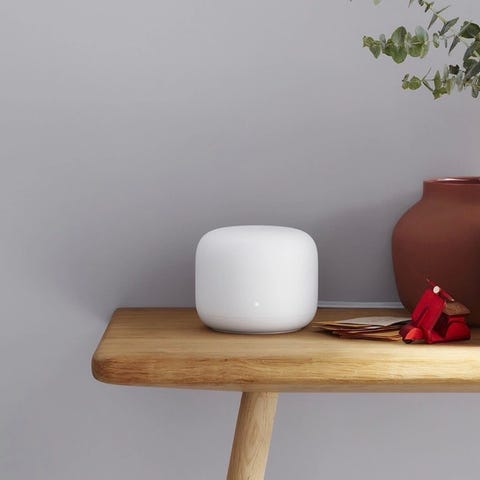 Google Nest Wifi Router er en enhet for datanettverk som fungerer som en ruter. Den har en rund, hvit design og er egnet for å forbedre trådløst nettverk i hjemmet.
