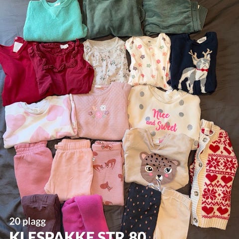 Pent brukte klær i strl 86/92. Den lys lilla settet er str 86, men romslig. De andre klærne er i str 92. Burgunder sett fra name it. Resterende fra hm. Ingen tydelig anmerkninger.
