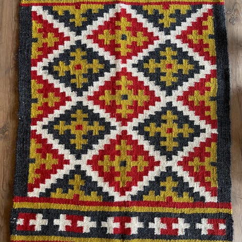 Kleim teppe med fargerikt geometrisk mønster. Passer til bruk på gulv for dekorasjon. Ny vaskad och från rök och djur fritt hem.