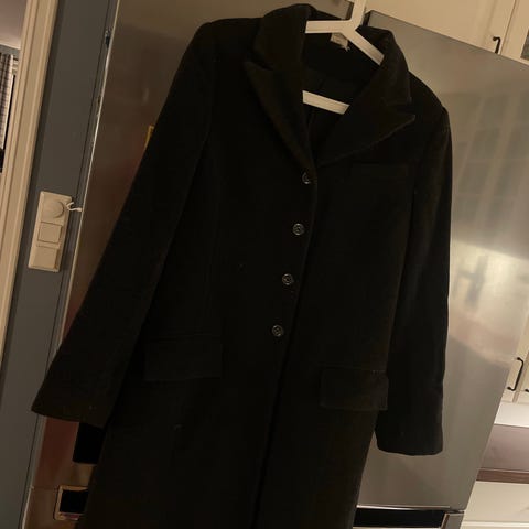 Svart kåpe i ull selges billig.