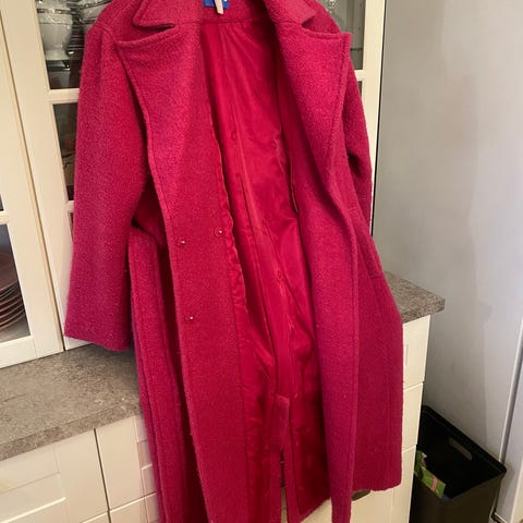 Går like under kneet. Utmerket stand, med nydelig vattert for. Materialet er ull og viskose