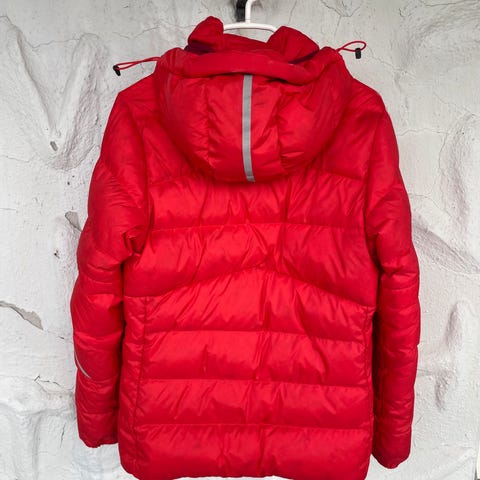Lett, varm og pen dunjakke perfekt til hverdag- og sportsbruk. Jakken er brukt kun få ganger. Mørk blå med rosa for. Avtagbar hette.