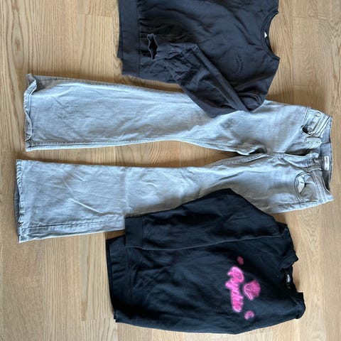 Nike genser i blålilla farge størrelse 166 for jenter. Laget av en blanding av 97% bomull og 3% elastan. Gina Tricot sett i fargen mørk blå. 50% bomull og 50% polyester. Knallgodt sett med vidde i bena. Tøff og god rosa college genser av 70% bomull og 30 polyester. Veldig gode bruksklær som matcher. Selges som pakke, kr 300.-