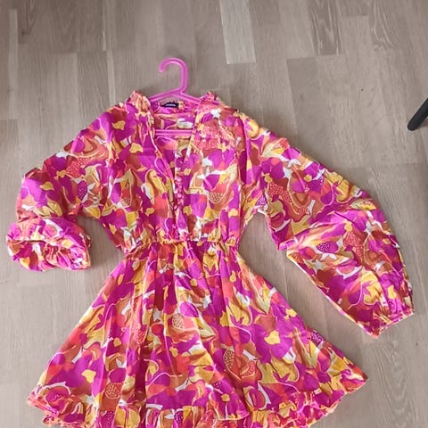 Ganni Andre topper i størrelse 38, laget av bomull. Toppen har en rosa farge med mønster i svart. Er ubrukt, men tag mangler.