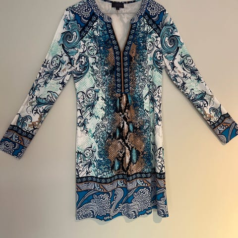 Hale Bob festkjole / hverdagskjole / helårskjole! størrelse M, flerfarget mønster og laget av polyester. Kjolen har belte og lange ermer,kan brukes uten belte, også kul til bukser og boots! Brukt en gang!