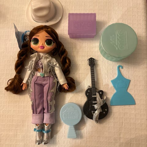 Dukken er 80cm høy, kan snakke og det er mulig å bevege på armer/ ben og få den til å sitte.