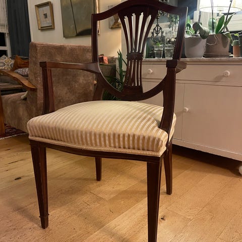 Sett med 7 solide trestoler i klassisk, gammel stil. Tidstypisk design med god kvalitet. Passer godt til spisebord eller som dekorative stoler i eldre eller landlig interiør. Normalt bruksslitasje.