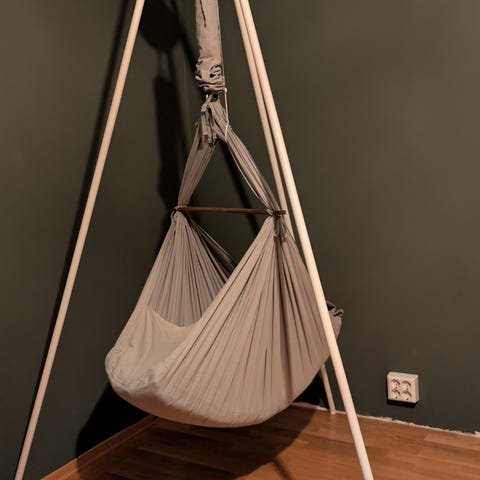 Vuggen kommer med et helt ubrukt stativ, ligger fortsatt i esken da vi har hatt to stativ(Selger bare med ett stativ). Følger også med vanntett madrassbeskytter, myggnetting og en ekstra ubrukt hengevugge da knappen på den ene røk. Men vi har kun hatt i bruk den hvor knappen røk da det fint gikk å bruke den.
