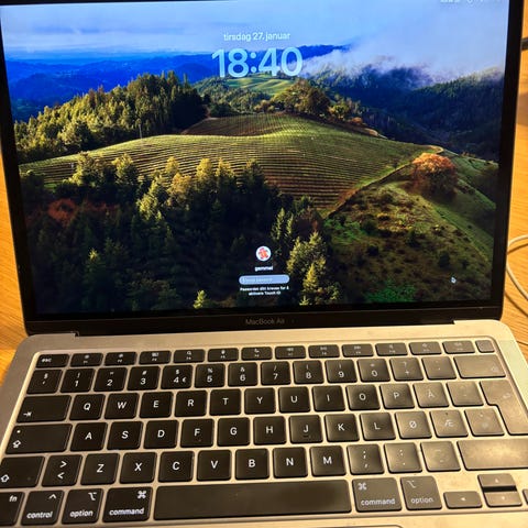Selger en brukt MacBook Air M1 fra 2020. Retina 13,3 tommers skjerm. Den er godt brukt, hovedsakelig til studier, men den er i god stand og fungerer som den skal. Det er en liten ripe / hakk på siden som kan ses på det siste bildet.
