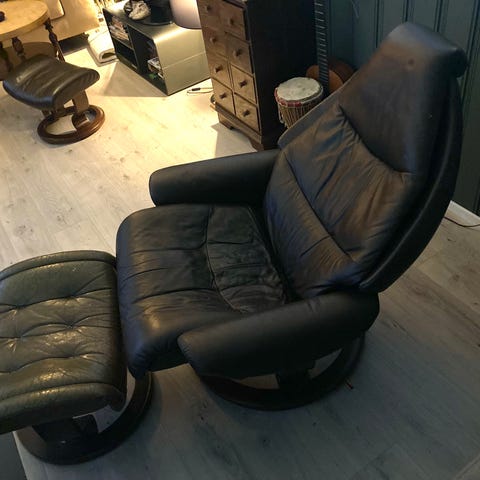 Selges samlet for kr 1 000,-, eller enkeltvis for kr 500,- pr stol og kr 200 for fotskammel.