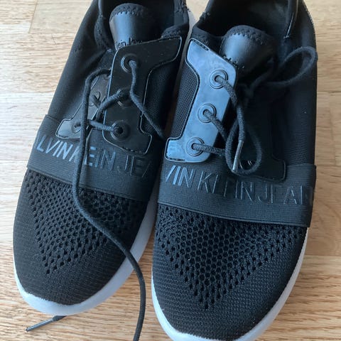 Calvin Klein Sneakers joggesko i størrelse 39. Skoene har en kombinasjon av svart og hvit farge med mesh-detaljer for pusteevne. Designet for daglig bruk og komfort. Skoene er laget i skinn og syntetisk materiale.