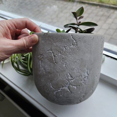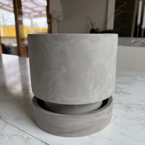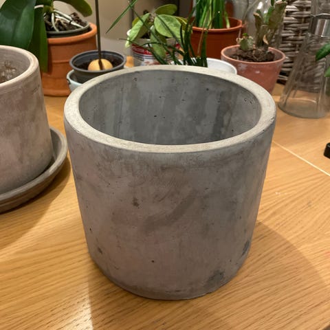 Granit blomsterpotte laget av betong selges. Nypris kr 499. Potten har en rund form og en naturlig betongfarge. Potten 25cm høy, intern diameter 23cm (ekstern 26).