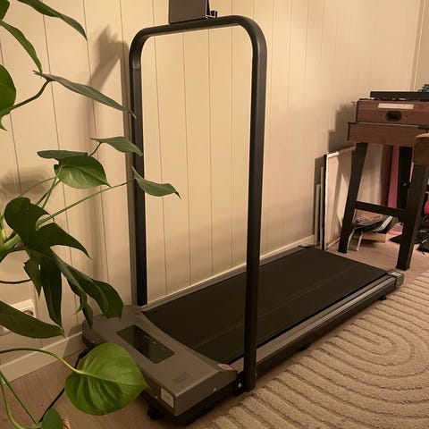 Løpebånd i svart farge med håndtak og digital skjerm. Egnet for innendørs bruk til gange og løping. Kompakt design for plassbesparende trening.