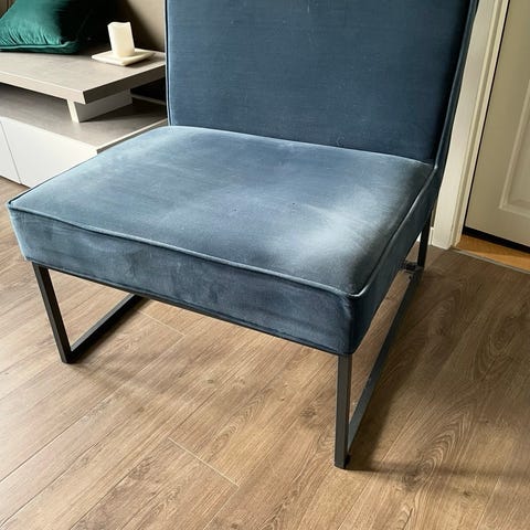 Lenestol i svart stoff med ben i krommetall. Tung, solid og stabil.