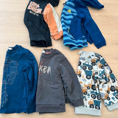 Tre Adidas sett, ett i str 98 og to i 104. Det rosa settet har litt nupper, men jeg har fått bort det meste, ellers en svak flekk på den ene armen.