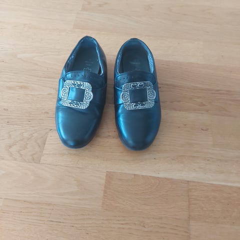 Bunadssko for barn i størrelse 31. Skoene er svarte og har en dekorativ spenne på forsiden.