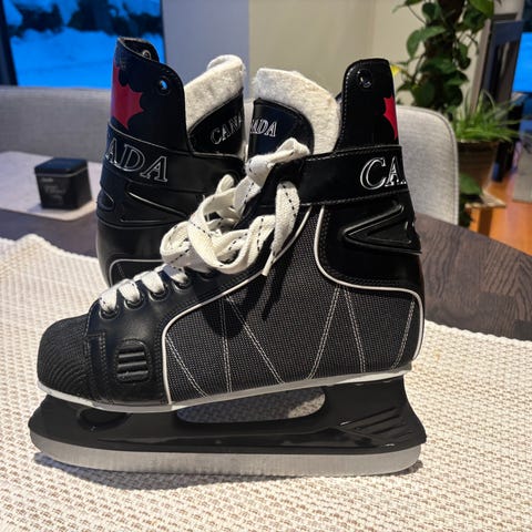 Canada ishockeyskøyter i størrelse 46, med svart farge. Skøytene er designet for ishockey og har standard konstruksjon for denne sporten.