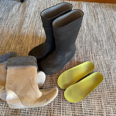 Medfølger ullfor med ullsåler, ekstra såler til bruk som gummistøvler uten for.