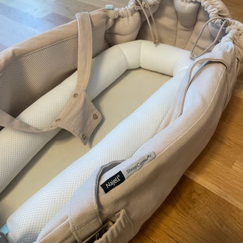 Beige najell sleepcarrier selges. Denne har vært gull verdt i vognen og til å frakte baby rundt omkring på for eksempel besøk eller levering av søsken i barnehage.