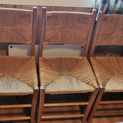 En stol har sprekker i treverket på undersiden og har derfor blitt limt. Har ikke undersøkt nærmere hvordan tilstanden er men det virker absolutt som at den kan bli helt fin igjen med litt kjærlighet.