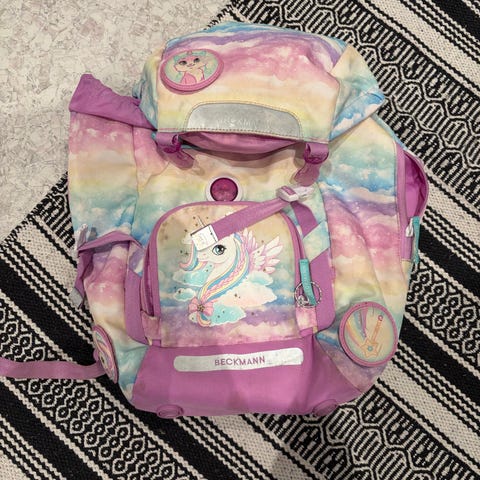 Tursekk / skolesekk til barn. I god stand, men mangler innerstrikk. Noe man nødvendigvis ikke er avhengig av da den også strammes fra utsiden