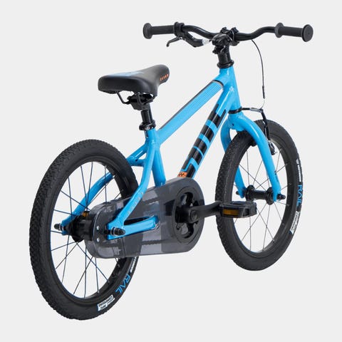 Sykkelen har en rosa ramme og er designet for barn. Perfekt som en førstegangs sykkel.