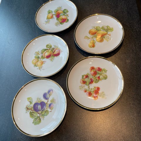 6 stk fruktallerkner med gullkant. Noen er som nye og noen har slitasje på gullkant. Ingen nag eller slitasje på bildene i midten.