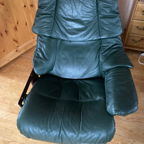 Fin og komfortabel stol, men det høyre armlenet har et søkk. Det er en knukket plate under som man sikkert kan fikse hvis man er handy, men stolen kan fortsatt brukes uten det. Må hentes.