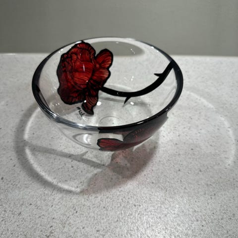 Gammelt fat på stett, med gjennombrutt blonde. Bredde 20 cm, høyde 8 cm.