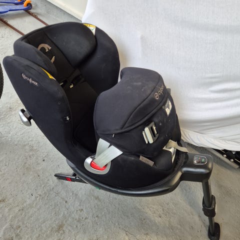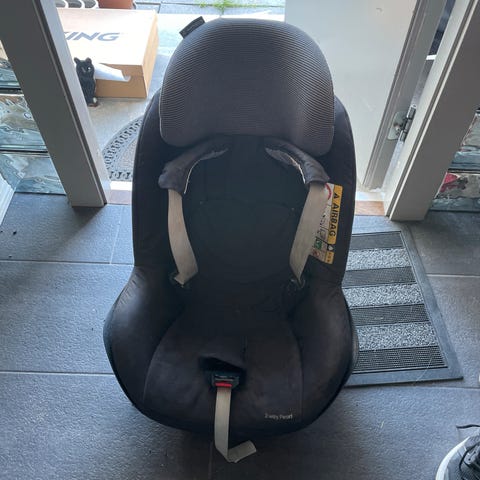 Bilstol som kan snus til side for å lettere løfte ut barnet.
