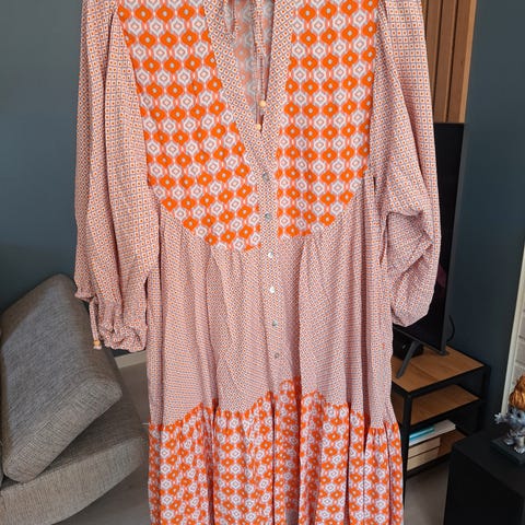 Utrolig vakker sommerkjole i et nydelig mønster. Kjolen er fra det australske merke Jaase. Luftig og god på varme dager. Splitt foran, lommer på sidene, knapper helt ned til splitt, pen v-utringning, og smock i midjen som kan passe til flere størrelser. Passer til meg som er 162 cm. Kun brukt én gang til uteksaminering. ☀️🌺