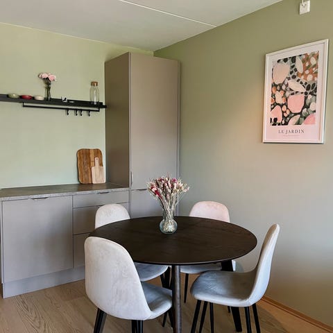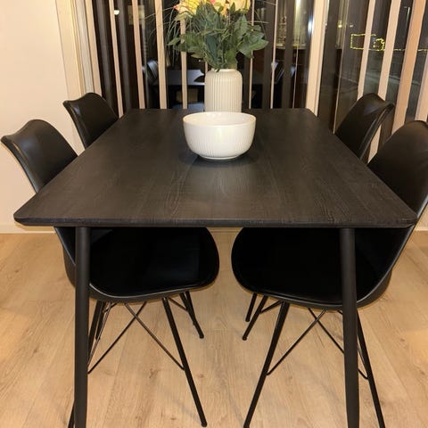 Pent brukte spisestoler. 4stk. Greige. Gode å sitte i. Trenger flerne stoler men akk denne modellen er ut av produksjon. Selges derfor samlet.