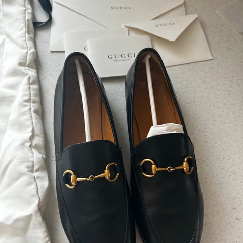 Pent brukte gucci jordan loafers i str 38 selges da de kun er blitt brukt to ganger siden de ble kjøpt, ellers oppbevart i garderobe i silkeposer, fremstår derfor som nesten nye. Kommer i original eske med poser og ekthetsbevis. Nypris: 10 500kr, selges for hbo5000,-