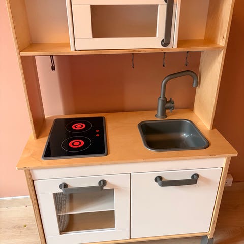 IKEA lekekjøkken i tre med hvit og naturlig trefarge.