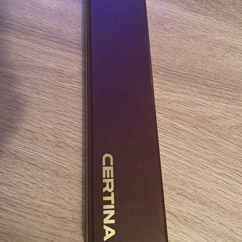 Olmadameklokke med gullfarget urkasse og lenke. Klokken har en rund urskive med visere og markører. Urkassen har bakdeksel i rustfritt stål. Analog visning uten ytterligere spesifiserte funksjoner. Den er gammel og trenger nok en service