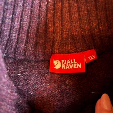 Devold høyhalset genser laget av ull i fargen hvit. Genseren er i størrelse M og designet for kvinner. Den har glidelås i halsen og detaljer i rødt på ermer og hals.